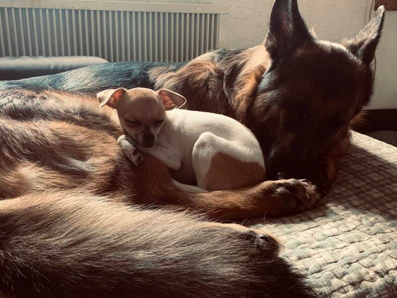 Oliver belehrte uns eines besseren und ist ein super "Papa" für den kleinen Chihuahua.